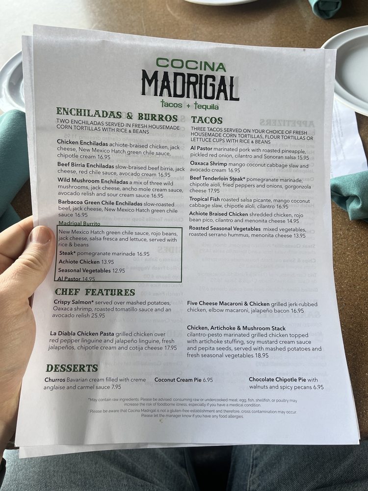 Cocina Madrigal, a Latinx-owned restaurant in Phoenix, offers a diverse menu of Tacos, Burgers, and Salads. With options for vegans and a relaxed, casual ambiance, it's a popular spot for brunch, lunch, and dinner. Customers rave about the flavorful dishes, from Al Pastor and Oaxaca Shrimp Tacos to Crispy Salmon and Chicken Enchiladas. Prices are reasonable, with standout items like the Mushroom Enchilada and Beef Tenderloin Taco earning high praise. The service is friendly and efficient, with the option for takeout and delivery. The outdoor seating is a plus, despite some noise inside. Overall, Cocina Madrigal is a must-visit for authentic Mexican cuisine in a homely atmosphere, perfect for both locals and visitors alike.